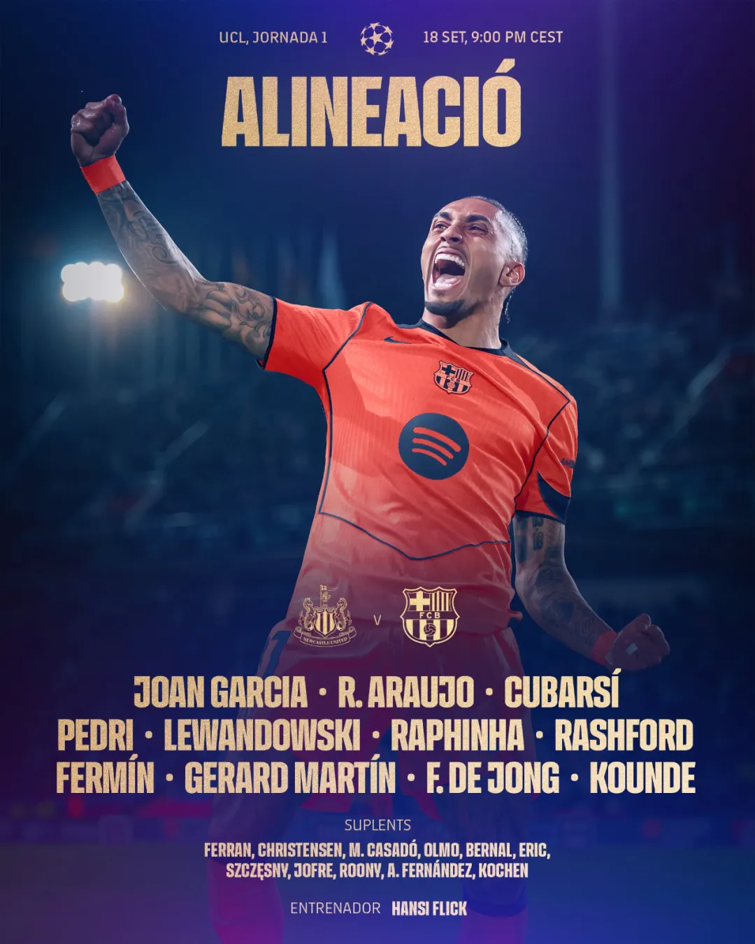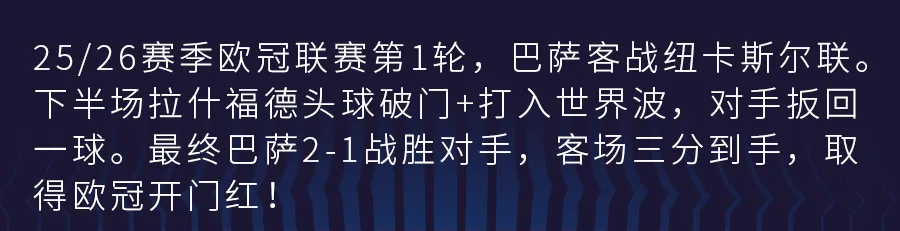 全场比赛结束,凭借拉什福德的梅开二度,巴萨2-1战胜纽卡斯尔联,客场3分落袋,取得欧冠开门红!