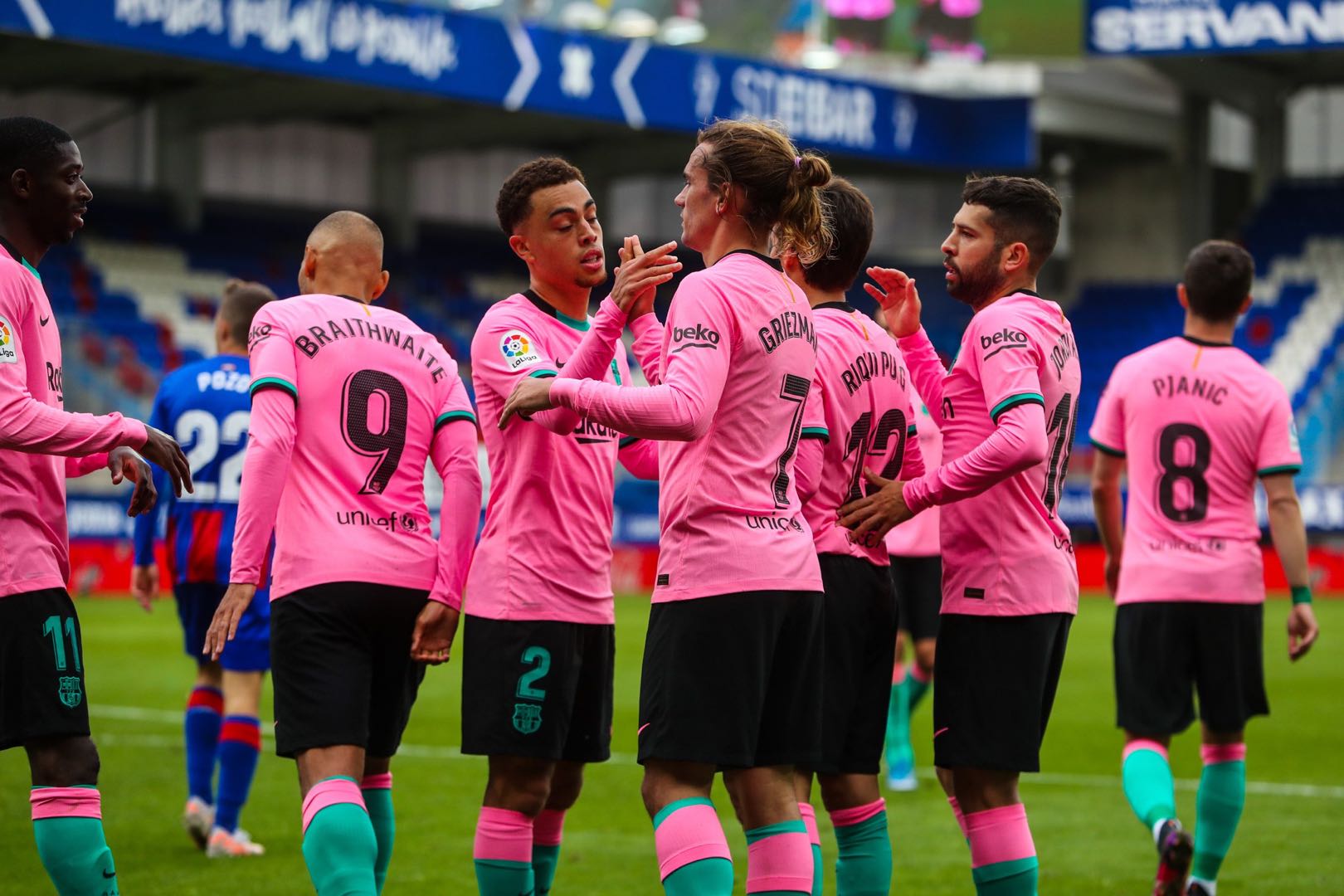 比赛第80分钟,登贝莱右路带球突进,小禁区内将球传给格列兹曼,后者侧身凌空抽射,皮球应声入网。埃瓦尔0-1巴萨!