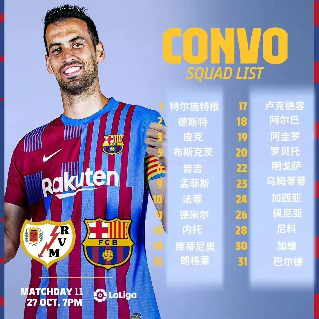 (*据俱乐部最新官方消息,法蒂右膝受伤,将缺席本场比赛)