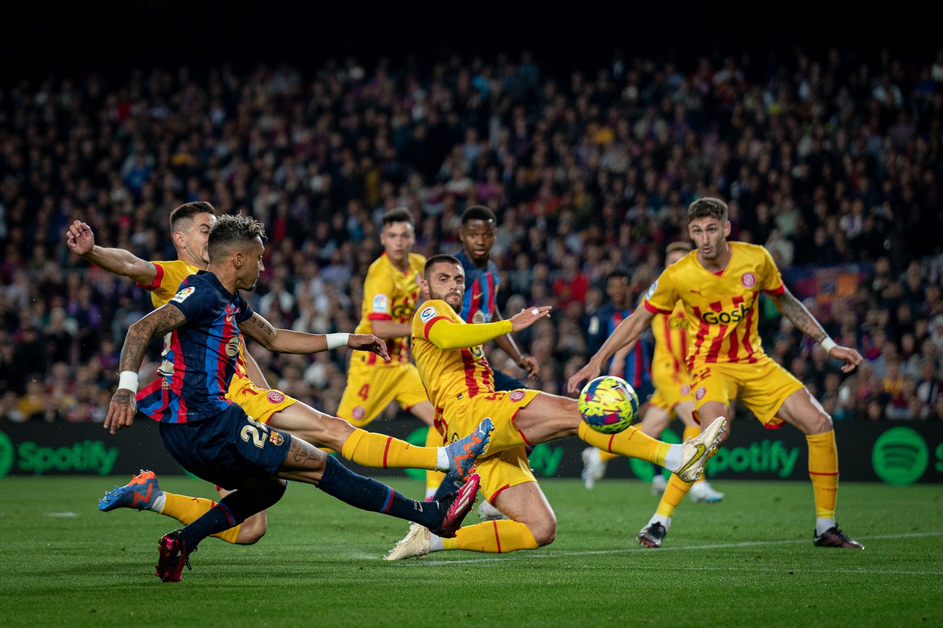 比赛第44分钟,拉菲尼亚分球法蒂,法蒂迎球怒射,打高了。