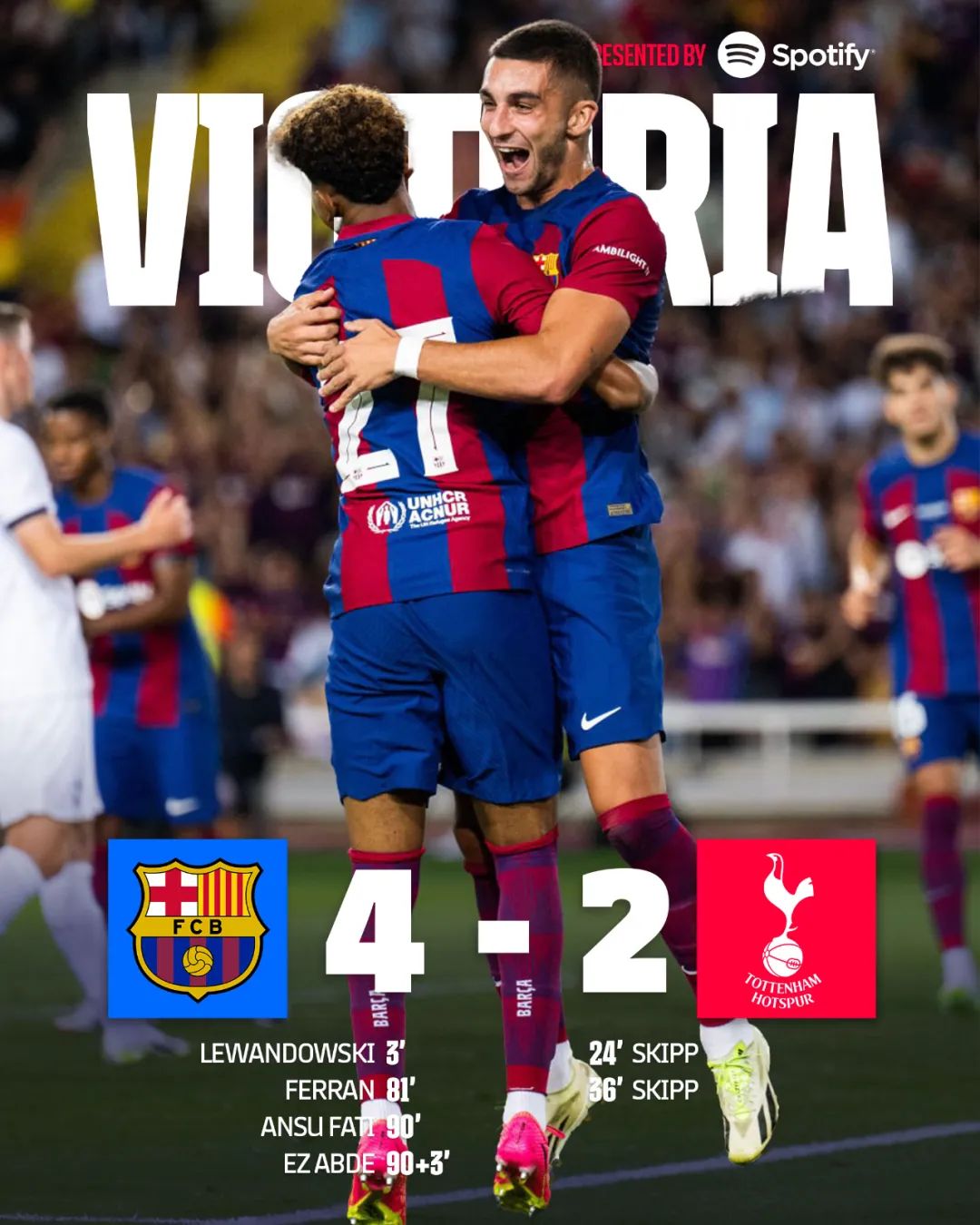 补时阶段,亚马尔直塞,费尔明倒三角传中,阿卜杜推射破门,巴萨4-2热刺!拿下甘伯杯!