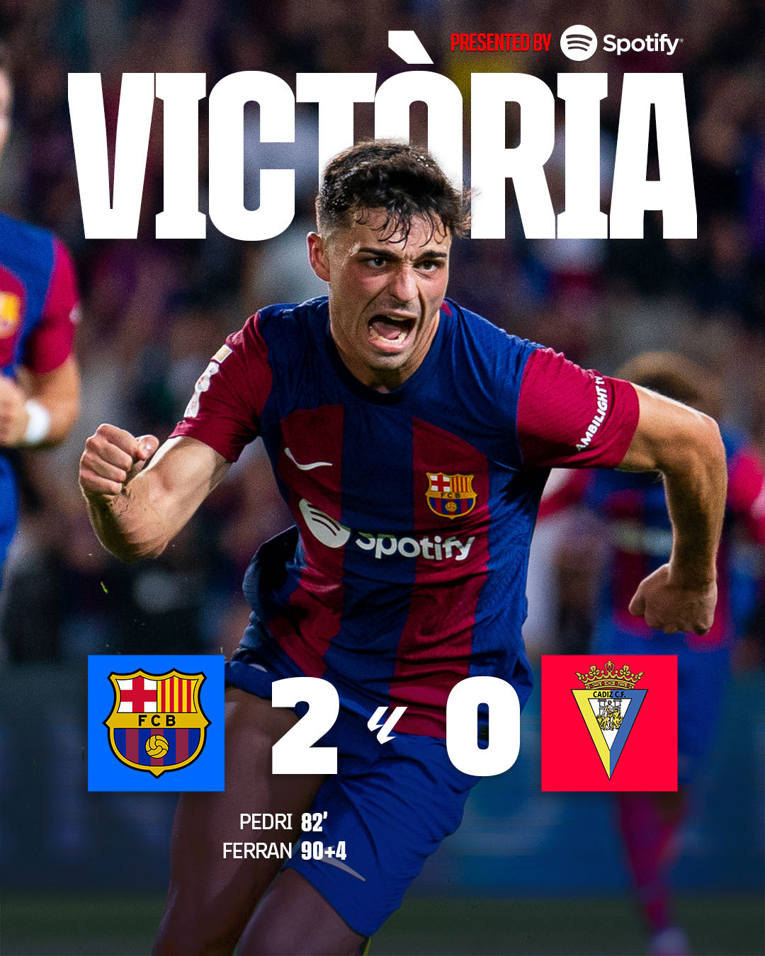 全场比赛结束。巴萨主场以2-0战胜加的斯,双方在上半场都没有取得进球。下半场凭借佩德里与京多安的巧妙配合,巴萨取得了领先。此后全队士气大振,替补出场的费兰在补时阶段再下一城,为巴萨锁定胜局,不仅取得了新赛季的西甲首胜,也为全体萨迷献上了一份最好的乔迁大礼。