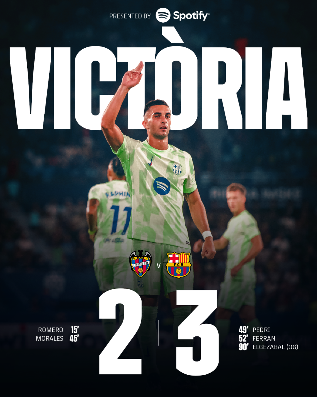 全场比赛结束,巴萨让二追三,逆转战胜莱万特,客场全取3分!