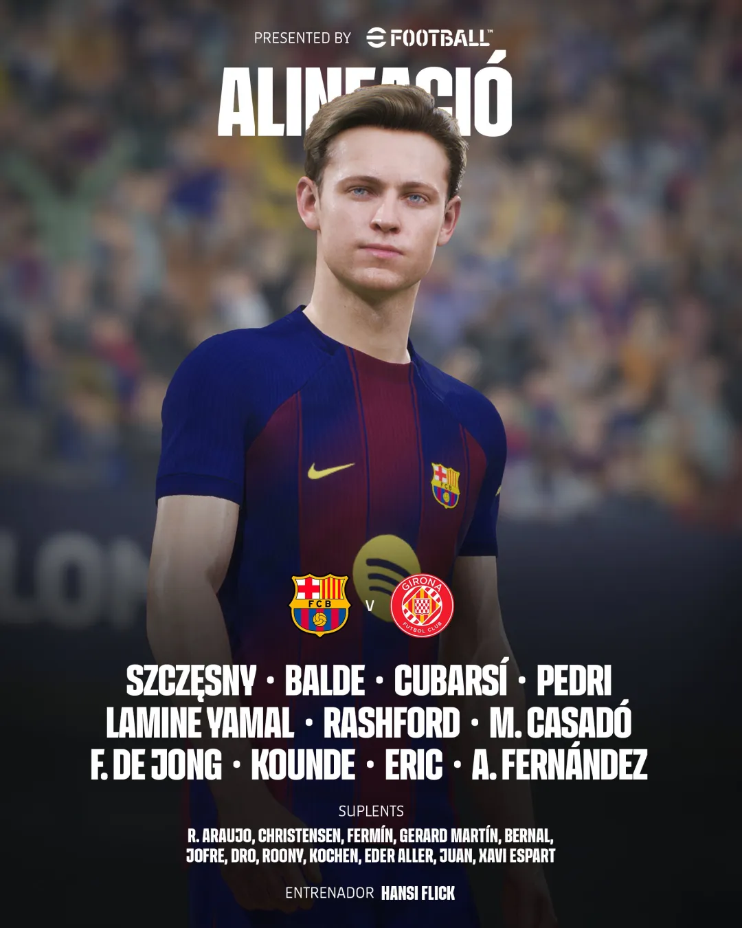 中场:8-佩德里(63' 克里斯滕森),21-德容,17-卡萨多(81' 阿劳霍)
