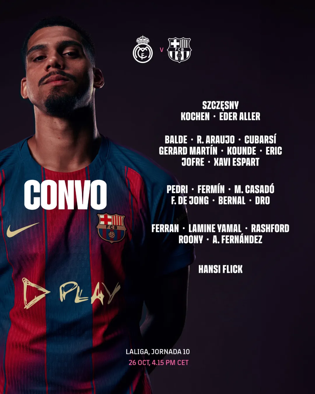 缺席:特尔施特根、加维、莱万多夫斯基、拉菲尼亚、乔安·加西亚、克里斯滕森、奥尔莫