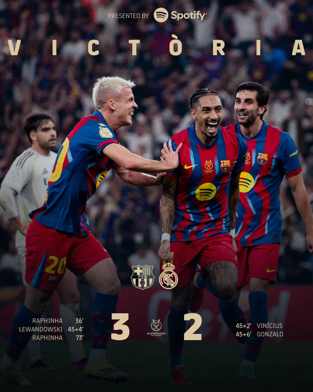 全场比赛结束,巴萨3-2击败皇马,成功完成卫冕,新年首冠+队史第16座西超杯到手!红蓝再度加冕,冠军属于巴塞罗那!