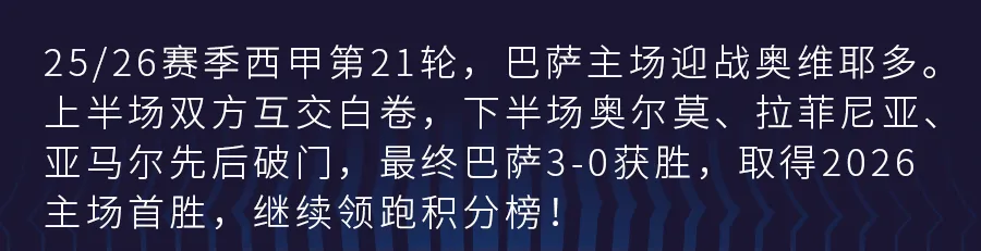 全场比赛结束,巴萨三球大胜奥维耶多,主场全取三分,迎来2026年Spotify诺坎普首胜,继续领跑积分榜!