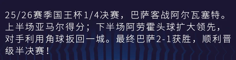 全场比赛结束,巴萨客场2-1击败阿尔瓦塞特,成功挺进国王杯四强!