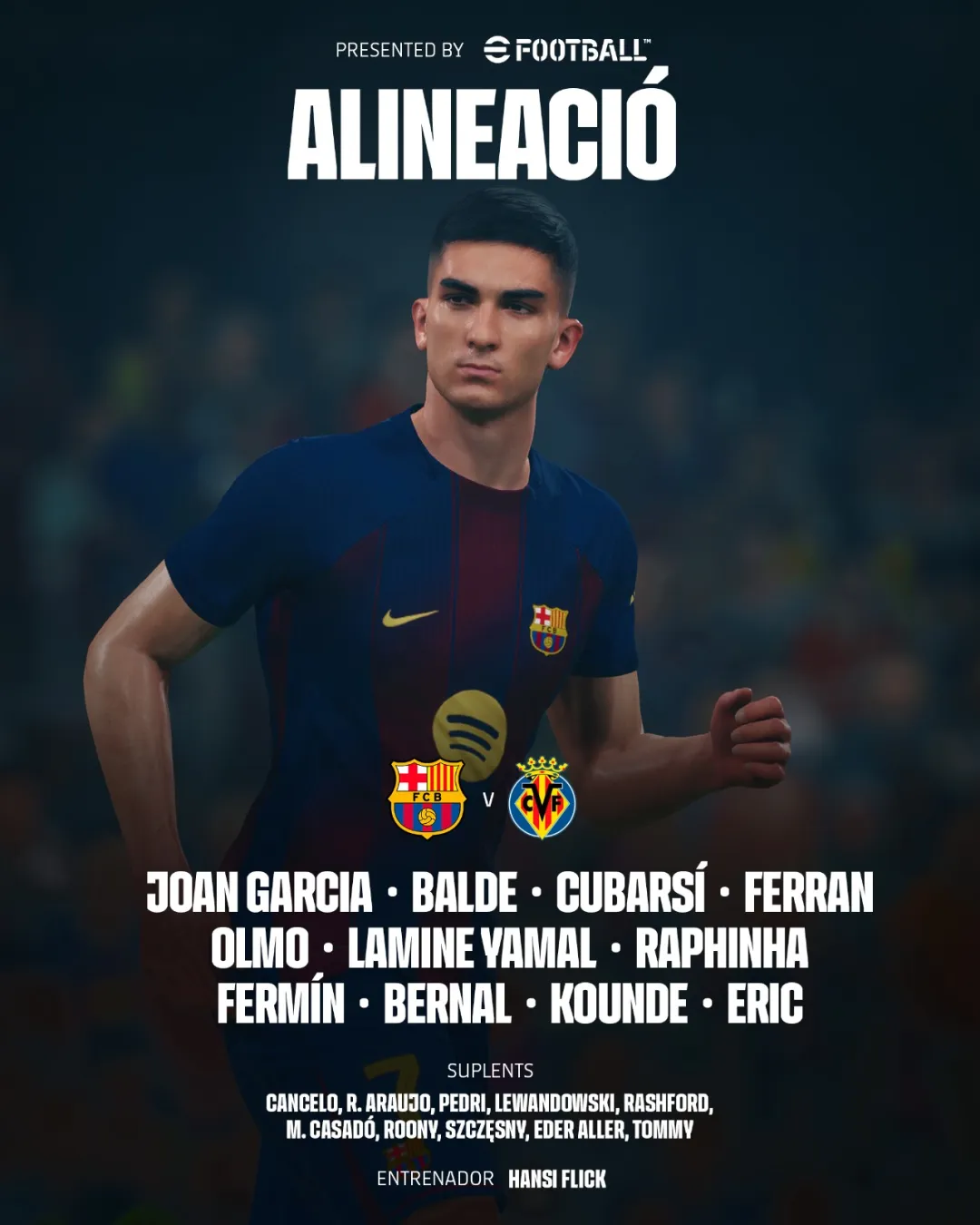 前锋:10-亚马尔(73' 巴尔德吉),7- 费兰(67' 莱万多夫斯基),11-拉菲尼亚(73' 拉什福德)