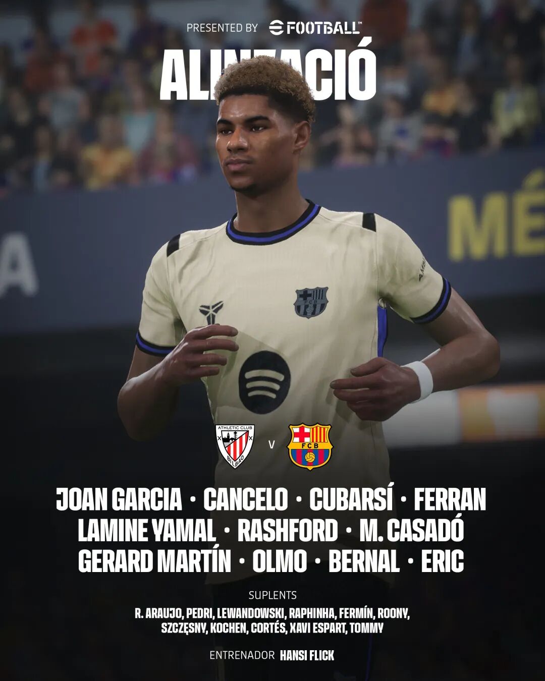前锋:10-亚马尔,7- 费兰(61' 莱万多夫斯基),14-拉什福德(61' 拉菲尼亚)