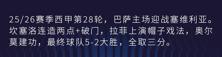第51分钟,费尔明突破后送助攻,拉菲尼亚打门,皮球击中后卫折射入网,帽子戏法!巴萨4-1领先。