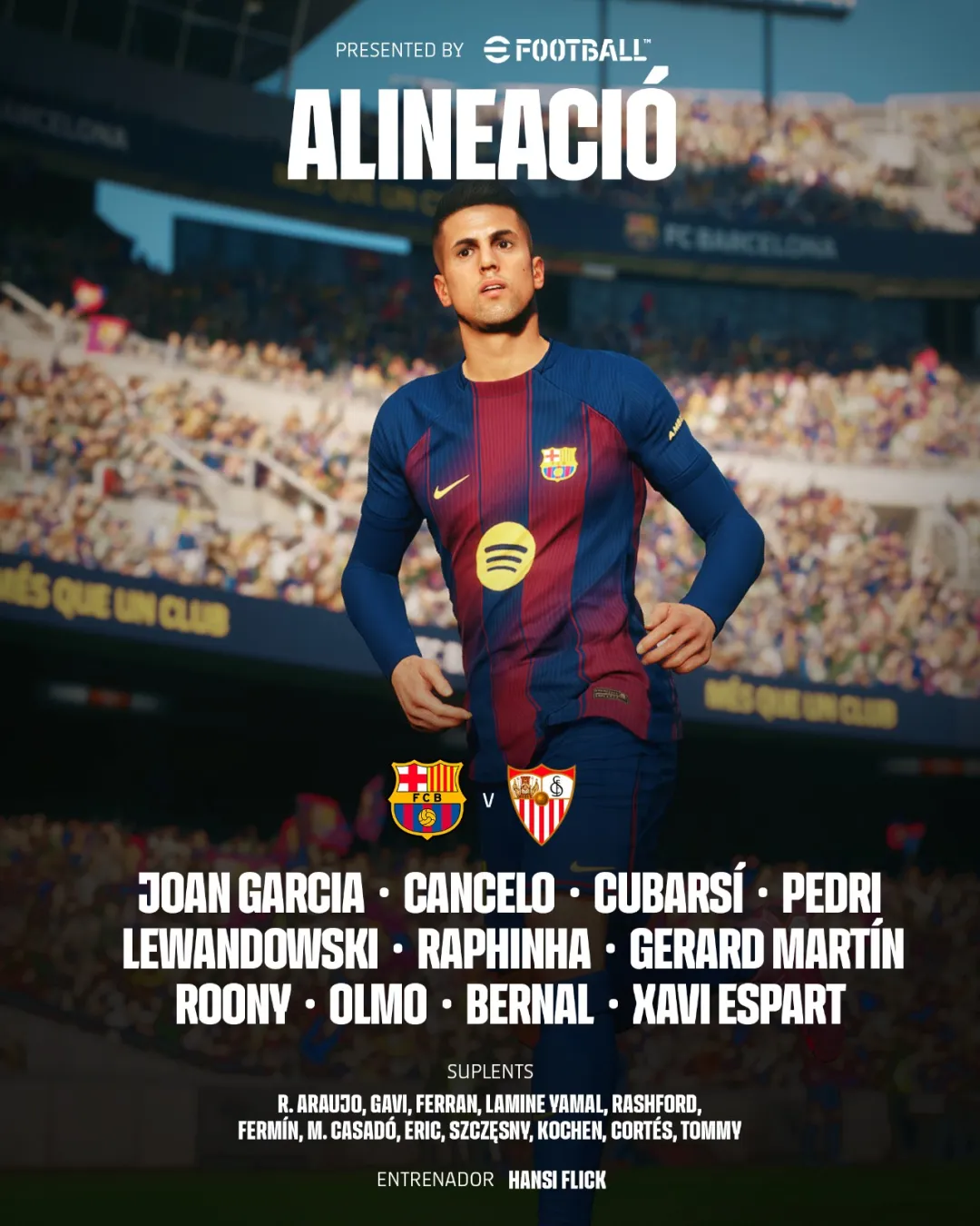 前锋:19-巴尔德吉(66' 亚马尔),9-莱万多夫斯基,11-拉菲尼亚(82' 加维)