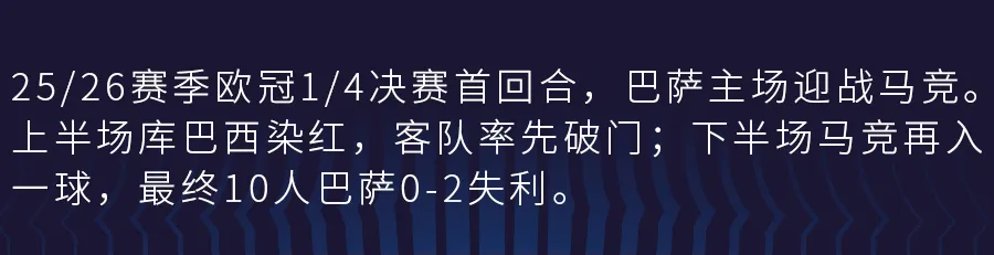 第44分钟,库巴西染红被罚下,巴萨10人应战,随后阿尔瓦雷斯任意球直接破门,巴萨0-1落后。