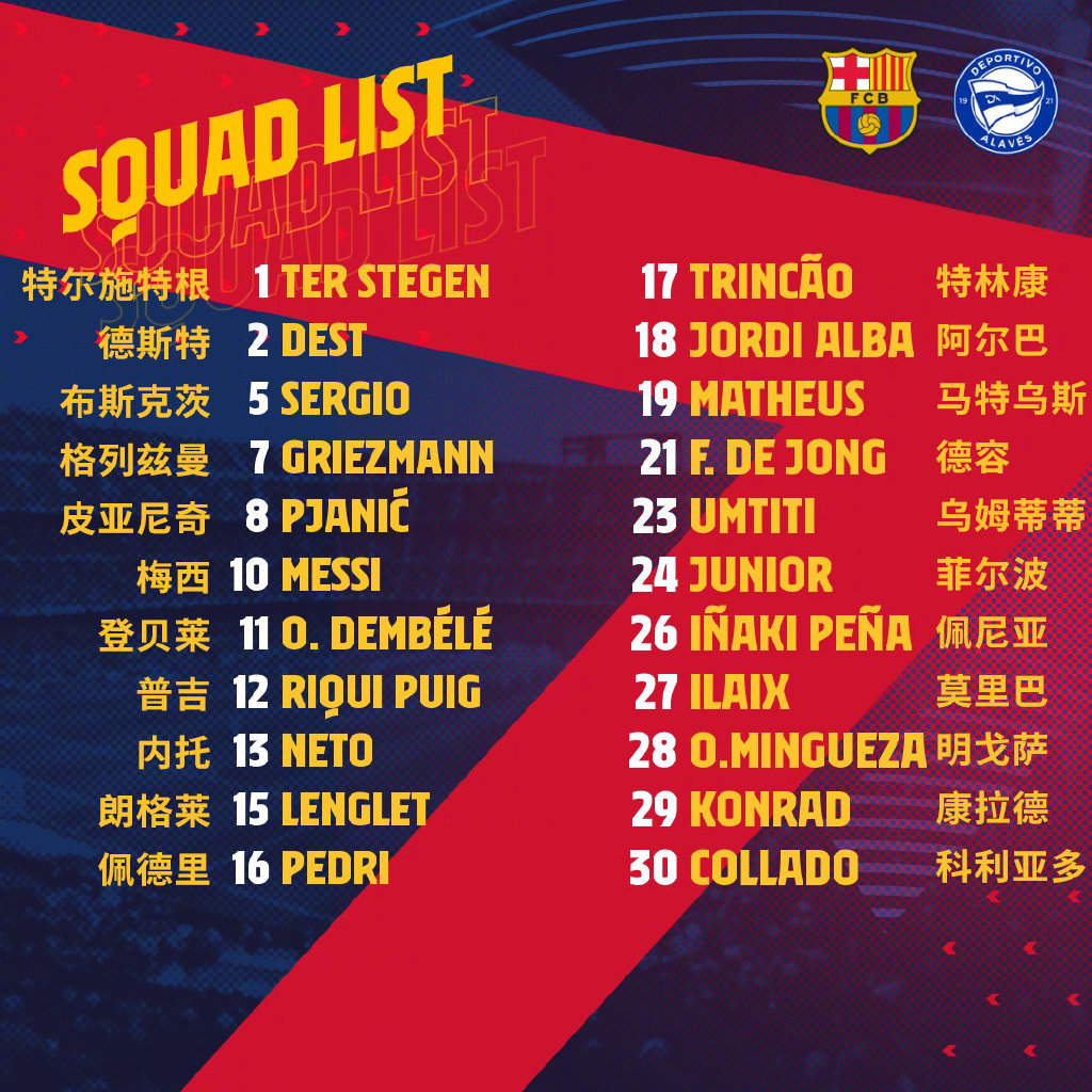 伤病:法蒂、皮克、库蒂尼奥、罗贝托、阿劳霍、布莱斯维特